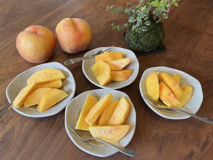 20258/8 お知らせワッサー 収穫 ワッサーは、桃とネクタリンを掛け合わせた長野県生まれの果実。桃の甘さと果汁、ネクタリンの歯応えが特徴です。桃と比べて日持ちもするので、ゆっくり楽しめます。お盆明けまで何回かに分けて収穫します。ご興味のある方はぜひお問い合わせください。 前の記事へ 次の記事へ