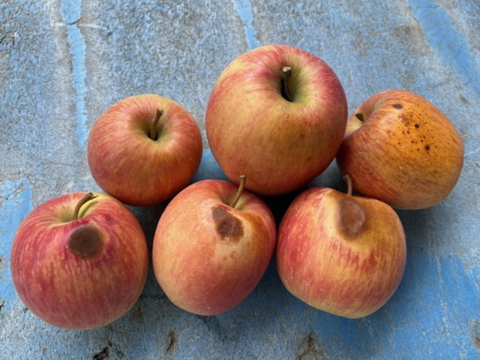 20259/12 りんごのこと日焼け果 9月に入っても暑い日が続いています。気温が下がらないとりんごが赤く色づきません。それどころか日差しが強すぎて、りんごの果皮がオレンジ色になったり、日焼けして茶色くなったり。今年はこのような「日焼け果」が多くなりそうです。(2枚目の写真はシナノドルチェ) 前の記事へ 次の記事へ